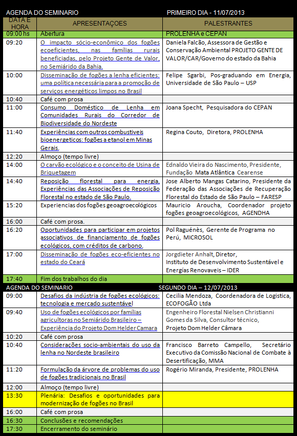 4 de dezembro de 2025 Eventos 0 Comment Agenda – 1º Seminário Brasileiro sobre Fogões Ecológicos Atividades ocorridas no evento:Clique aqui para ver as fotos do evento.Assista aos vídeos do evento.Lista dos participantes do evento.Conclusões do Seminário.Links úteis:1) Prospecto em português da Aliança Global para Fogões Limpos para Rio+20.2) Link da Aliança Global para Fogões Limpos: www.cleancookstoves.org3) Seminário Internacional Poluíção Doméstica 2006: Arquivo em PDF INÍCIO CONCLUSÕES Acessar site oficial do evento