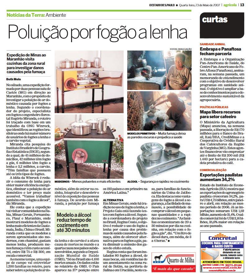 A ideia da Winrock é reduzir o consumo de lenha para obter maior eficiência energética, eliminar a poluição do ar doméstico e ter preço mais acessível. “Vamos trabalhar também com o fogão a álcool”, diz Miranda.