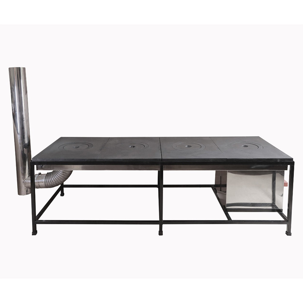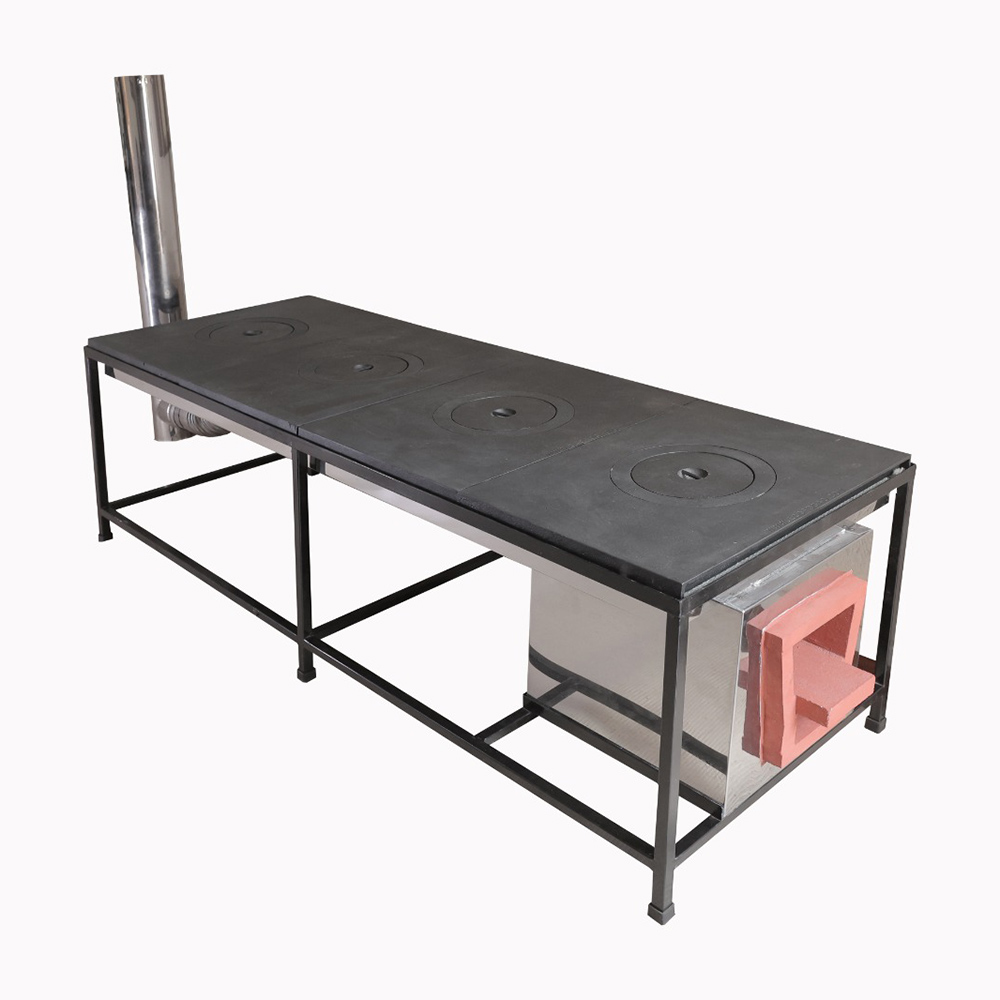 Modelo de 4 chapas de ferro fundido com 1 boca cada e respectivos anéis de redução nas medidas de 55 x 40 cm, cada módulo; que se encaixam perfeitamente entre si, evitando escape de fumaça e facilitando futuras manutenções.