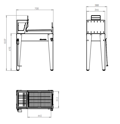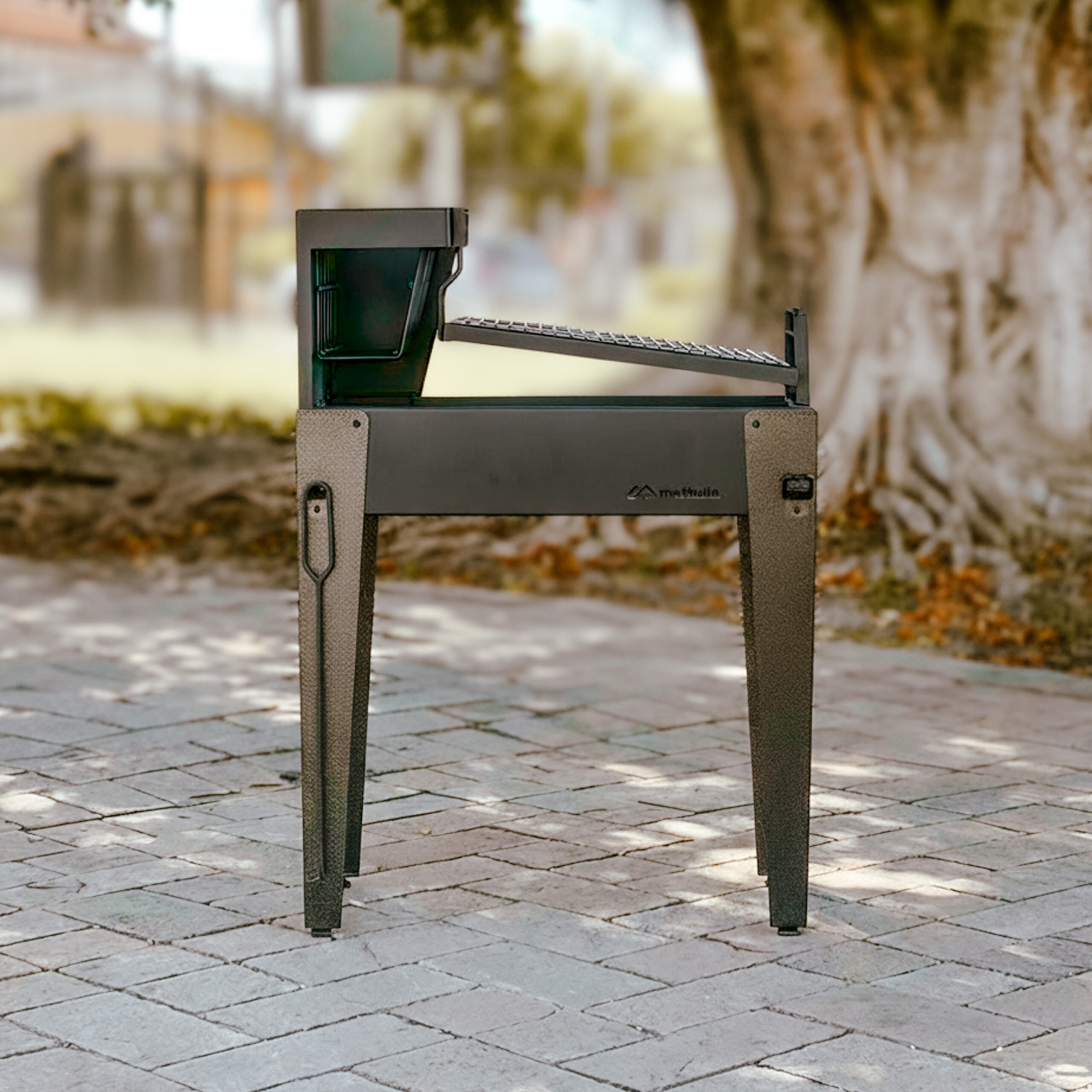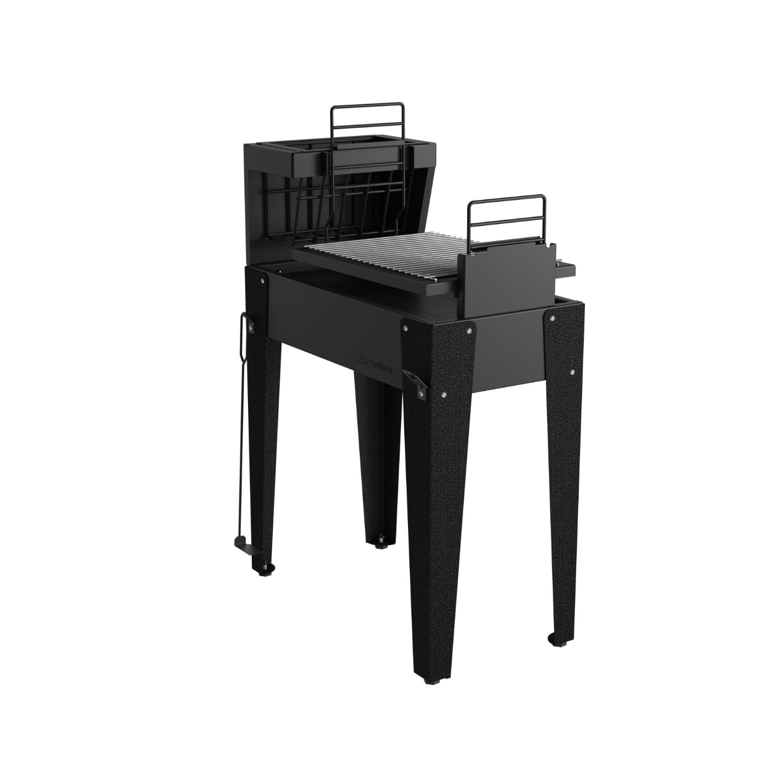 Fabricada em aço carbono 1,2 mm com pintura craquelada preta, combina durabilidade e estilo. Conta com duas grelhas uruguaias, pés niveladores, cesto para lenha e acessórios.